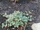 I began with the bones or larger elements. But in the process, knowing I also needed smaller edging plants, I found Acaena saccaticupula, or New Zealand Bur ‘Blue Haze’. A lovely blue-gray charmer, supposedly evergreen, with pinnate leaves. (I don’t know what “pinnate” means, but the leaves are petite, sharply edged, very interesting. I’ll look it up.) And the tag said Sun to Part Shade! I planted three along the walk several weeks ago and today I bought more because they just go so beautifully with the blue-gray in the stones. And I placed them along the part-shade side. Now we’ll see how they hold up. I’ll let you know my progress!