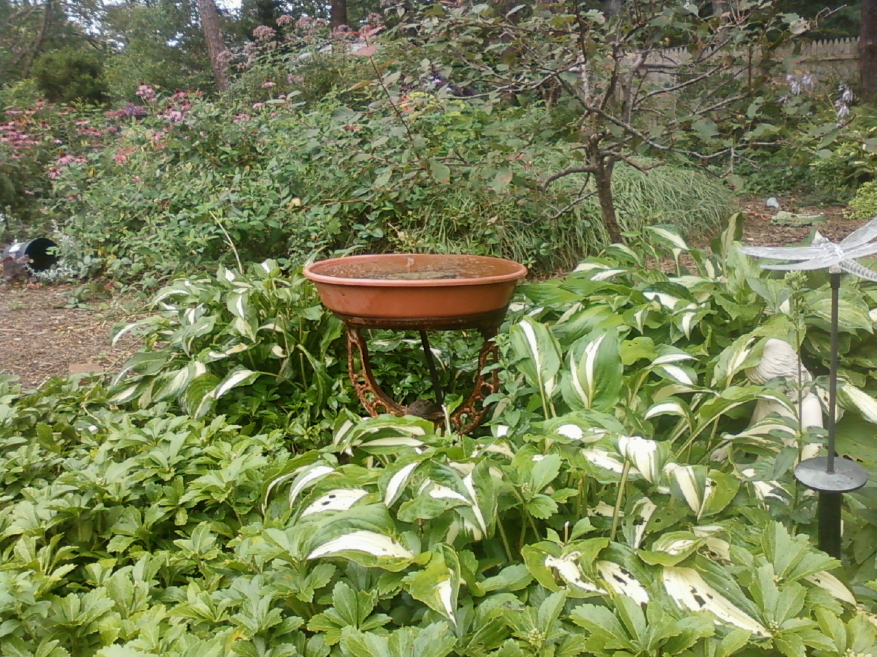 This is a homemade water feature with an interesting metal stand, a deeper plastic saucer as the birdbath, a plastic tub submerged in the ground filled with water and a pump with the hose attached through a hole in the saucer. Attach electricity and voila!