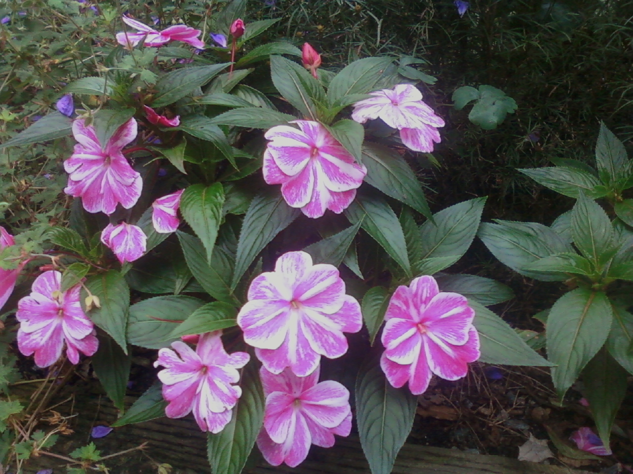 Linda likes pink so when I saw this striped version of a New Guinea I grabbed a dozen. And boy, not only did they look good through the summer but they look great now! Really makes the difference in mid-September to see these spots of joy. Hope to find it again next year. Linda was happy with this plant—and that makes all the difference.