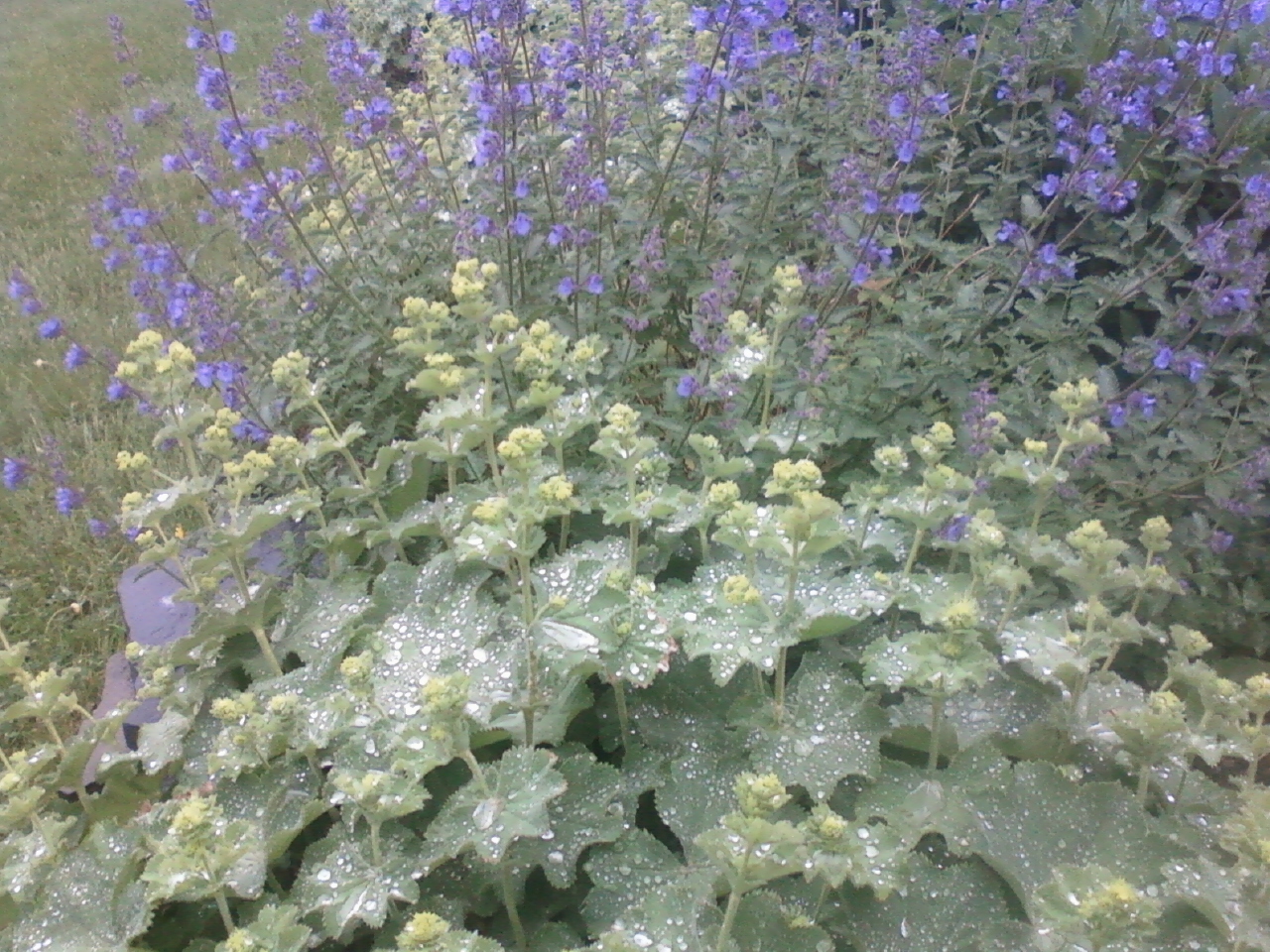 Even while getting caught in a downpour, there is beauty. Raindrops on lovely Lady’s Mantle, coupled with a nepeta. And you can grow that, too!!